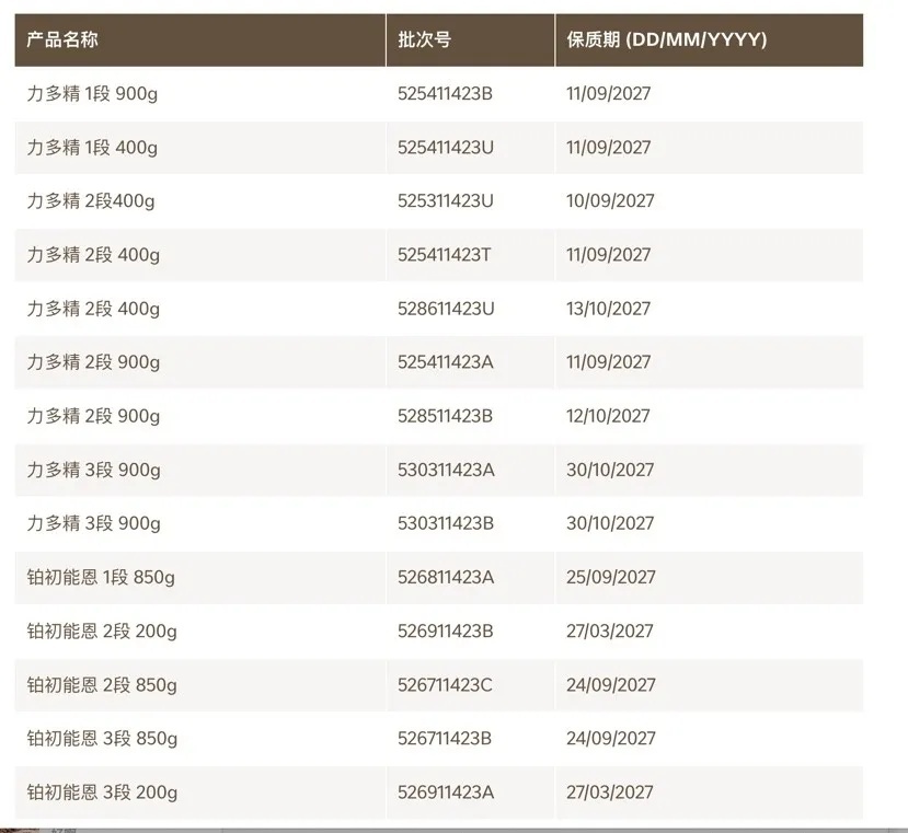 婴幼儿配方奶粉产品的召回通知