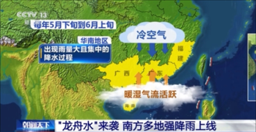 每年5月下旬到6月上旬也就是端午节前后,南方暖湿气流活跃,与从北方南进的冷空气在广东和广西、福建、海南一带交汇,华南地区往往会出现雨量大且集中的降水过程,这段时期的降水也常被人们称作“龙舟水”或是龙降水、端午水、端阳水等。气象学上为了便于统计,“龙舟水”一般指5月21日至6月20日的降水。